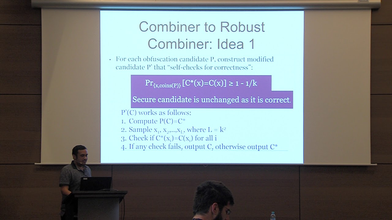 Abstract:Indistinguishability Obfuscation (iO) has enabled an incredible number of new and exciting applications. However, our understanding of how to actually build secure iO remains in its infancy. While many candidate constructions have been published, some have been broken, and it is unclear which of the remaining candidates are secure. This work deals with the following basic question: \emph{Can we hedge our bets when it comes to iO candidates?} In other words, if we have a collection of iO candidates, and we only know that at least one of them is secure, can we still make use of these candidates? This topic was recently studied by Ananth, Jain, Naor, Sahai, and Yogev [CRYPTO 2016], who showed how to construct a robust iO combiner: Specifically, they showed that given the situation above, we can construct a single iO scheme that is secure as long as (A) at least one candidate iO scheme is a subexponentially secure iO, and (B) either the subexponential DDH or LWE assumptions hold. In this work, we make three contributions: \begin{itemize} \item (\textbf{Better robust iO combiners.}) First, we work to improve the assumptions needed to obtain the same result as Ananth et al.: namely we show how to replace the DDH/LWE assumption with the assumption that subexponentially secure one-way functions exist. \item (\textbf{FE and NIKE from iO candidates and minimal assumptions.}) Second, we consider a broader question: what if we start with several iO candidates where only one works, but we don’t care about achieving iO itself, rather we want to achieve concrete applications of iO? In this case, we are able to work with the \emph{minimal} assumption of just polynomially secure one-way functions, and where the working iO candidate only achieves polynomial security. Under these circumstances, we show how to achieve both \emph{functional encryption} and \emph{non-interactive multiparty key exchance (NIKE)}. \item (\textbf{Correctness Amplification for iO from polynomial security and one-way functions.}) Finally, along the way, we obtain a result of independent interest: Recently, Bitansky and Vaikuntanathan [TCC 2016] showed how to amplify the correctness of an iO scheme, but they needed subexponential security for the iO scheme and also require subexponentially secure DDH or LWE. We show how to achieve the same correctness amplification result, but requiring only polynomial security from the iO scheme, and assuming only polynomially secure one-way functions. \end{itemize}