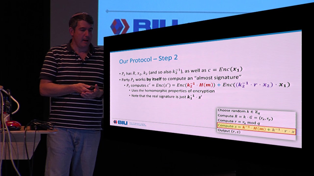Abstract:ECDSA is a standard digital signature schemes that is widely used in TLS, Bitcoin and elsewhere. Unlike other schemes like RSA, Schnorr signatures and more, it is particularly hard to construct efficient threshold signature protocols for ECDSA (and DSA). As a result, the best-known protocols today for secure distributed ECDSA require running heavy zero-knowledge proofs and computing many large-modulus exponentiations for every signing operation. In this paper, we consider the specific case of two parties (and thus no honest majority) and construct a protocol that is approximately two orders of magnitude faster than the previous best. Concretely, our protocol achieves good performance, with a single signing operation for curve P-256 taking approximately 37ms between two standard machine types in Azure (utilizing a single core only). Our protocol is proven secure for sequential composition under standard assumptions using a game-based definition. In addition, we prove security by simulation under a plausible yet non-standard assumption regarding Paillier. We show that partial concurrency (where if one execution aborts then all need to abort) can also be achieved.