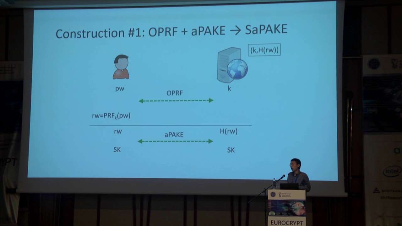Abstract:Password-Authenticated Key Exchange (PAKE) protocols allow two parties that only share a password to establish a shared key in a way that is immune to offline attacks. Asymmetric PAKE (aPAKE) strengthens this notion for the more common client-server setting where the server stores a mapping of the password and security is required even upon server compromise, that is, the only allowed attack in this case is an (inevitable) offline exhaustive dictionary attack against individual user passwords. Unfortunately, current aPAKE protocols (that dispense with the use of servers’ public keys) allow for pre-computation attacks that lead to the instantaneous compromise of user passwords upon server compromise, thus forgoing much of the intended aPAKE security. Indeed, these protocols use - in essential ways - deterministic password mappings or use random “salt” transmitted in the clear from servers to users, and thus are vulnerable to pre-computation attacks. We initiate the study of “Strong aPAKE” protocols that are secure as aPAKE’s but are also secure against pre-computation attacks. We formalize this notion in the Universally Composable (UC) settings and present two modular constructions using an Oblivious PRF as a main tool. The first builds a Strong aPAKE from any aPAKE (which in turn can be constructed from any PAKE [GMR’06]) while the second builds a Strong aPAKE from any authenticated key-exchange protocol secure against reverse impersonation (a.k.a. KCI). Using the latter transformation, we show a practical instantiation of a UC-secure Strong aPAKE in the Random Oracle model. The protocol (“OPAQUE”) consists of 2 messages (3 with mutual authentication), requires 3 and 4 exponentiations for server and client, respectively (2 to 4 of which can be fixed-base depending on optimizations), provides forward secrecy, is PKI-free, supports user-side hash iterations, has a built-in facility for password-based storage and retrieval of secrets and credentials, and accommodates a user-transparent server-side threshold implementation.