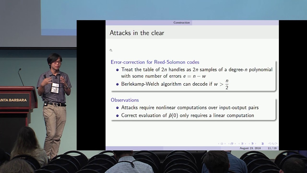 Abstract:We give a simple and efficient method for obfuscating pattern matching with wildcards. In other words, we construct a way to check an input against a secret pattern, which is described in terms of prescribed values interspersed with unconstrained “wildcard” slots. As long as the support of the pattern is sufficiently sparse and the pattern itself is chosen from an appropriate distribution, we prove that a polynomial-time adversary cannot find a matching input, except with negligible probability. We rely upon the generic group heuristic (in a regular group, with no multilinearity). Previous work provided less efficient constructions based on multilinear maps or LWE.