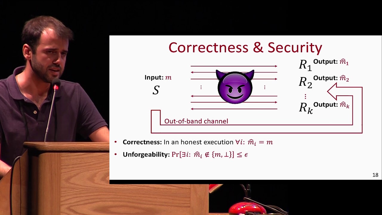 Abstract:Extensive efforts are currently put into securing messaging platforms, where a key challenge is that of protecting against man-in-the-middle attacks when setting up secure end-to-end channels. The vast majority of these efforts, however, have so far focused on securing user-to-user messaging, and recent attacks indicate that the security of group messaging is still quite fragile. We initiate the study of out-of-band authentication in the group setting, extending the user-to-user setting where messaging platforms (e.g., Telegram and WhatsApp) protect against man-in-the-middle attacks by assuming that users have access to an external channel for authenticating one short value (e.g., two users who recognize each other’s voice can compare a short value). Inspired by the frameworks of Vaudenay (CRYPTO '05) and Naor et al. (CRYPTO '06) in the user-to-user setting, we assume that users communicate over a completely-insecure channel, and that a group administrator can out-of-band authenticate one short message to all users. An adversary may read, remove, or delay this message (for all or for some of the users), but cannot undetectably modify it. Within our framework we establish tight bounds on the tradeoff between the adversary’s success probability and the length of the out-of-band authenticated message (which is a crucial bottleneck given that the out-of-band channel is of low bandwidth). We consider both computationally-secure and statistically-secure protocols, and for each flavor of security we construct an authentication protocol and prove a lower bound showing that our protocol achieves essentially the best possible tradeoff. In particular, considering groups that consist of an administrator and k additional users, for statistically-secure protocols we show that at least (k+1)\cdot (\log(1/\epsilon) - \Theta(1)) bits must be out-of-band authenticated, whereas for computationally-secure ones \log(1/\epsilon) + \log k bits suffice, where \epsilon is the adversary’s success probability. Moreover, instantiating our computationally-secure protocol in the random-oracle model yields an efficient and practically-relevant protocol (which, alternatively, can also be based on any one-way function in the standard model).
