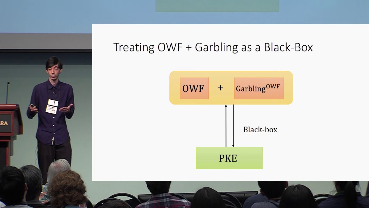 Abstract:Understanding whether public-key encryption can be based on one-way functions is a fundamental open problem in cryptography. The seminal work of Impagliazzo and Rudich [STOC’89] shows that black-box constructions of public-key encryption from one-way functions are impossible. However, this impossibility result leaves open the possibility of using non-black-box techniques for achieving this goal. One of the most powerful classes of non-black-box techniques, which can be based on one-way functions (OWFs) alone, is Yao’s garbled circuit technique [FOCS’86]. As for the non-black-box power of this technique, the recent work of Dottling and Garg [CRYPTO’17] shows that the use of garbling allows us to circumvent known black-box barriers in the context of identity-based encryption. We prove that garbling of circuits that have OWF (or even random oracle) gates in them are insufficient for obtaining public-key encryption. Additionally, we show that this model also captures (non-interactive) zero-knowledge proofs for relations with OWF gates. This indicates that currently known OWF-based non-black-box techniques are perhaps insufficient for realizing public-key encryption.