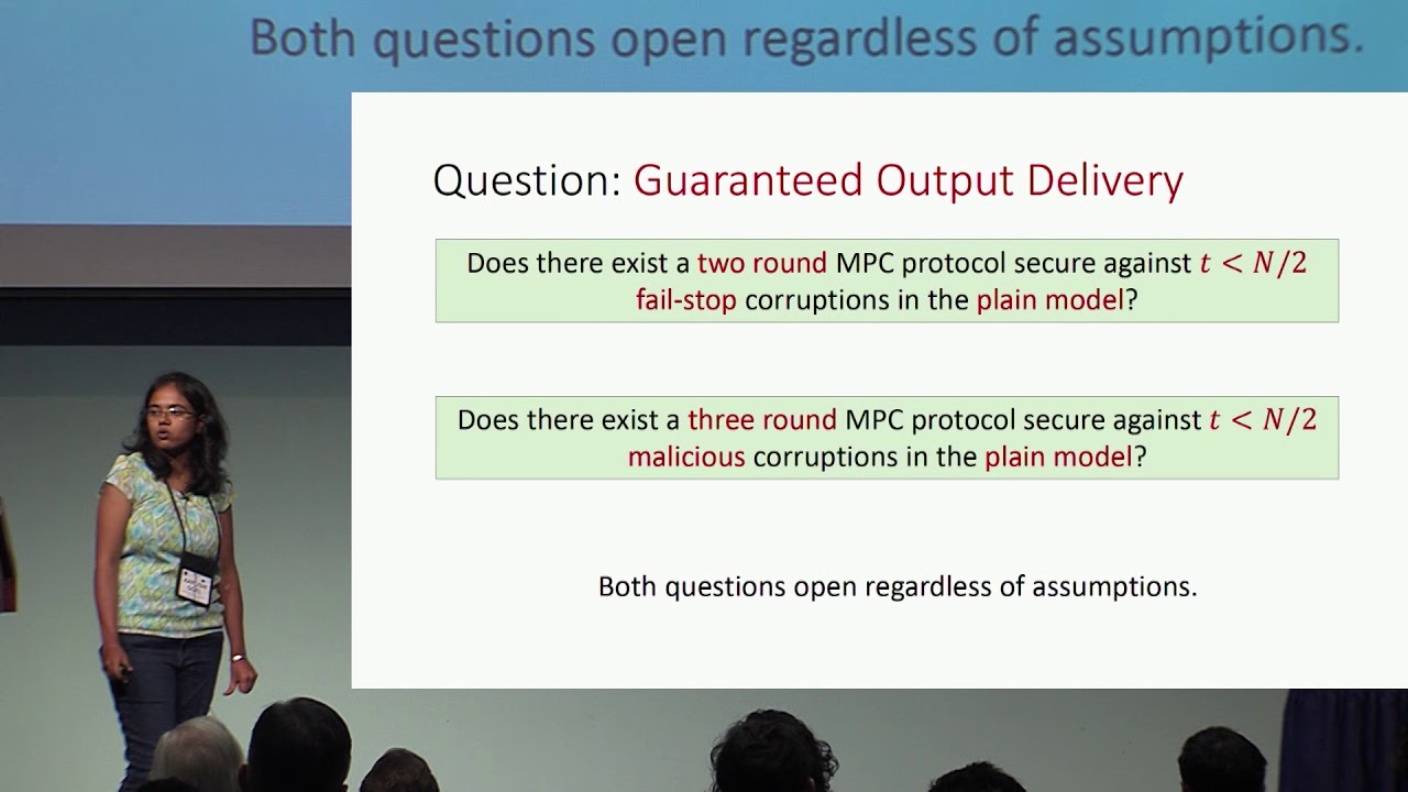 Abstract:We study the exact round complexity of secure multiparty computation (MPC) in the honest majority setting. We construct several round-optimal n-party protocols, tolerating any t<\frac{n}{2} corruptions. - Security with abort: We give the first construction of two round MPC for general functions that achieves security with abort against malicious adversaries in the plain model. The security of our protocol only relies on one-way functions. - Guaranteed output delivery: We also construct protocols that achieve security with guaranteed output delivery: (i) Against fail-stop adversaries, we construct two round MPC either in the (bare) public-key infrastructure model with no additional assumptions, or in the plain model assuming two-round semi-honest oblivious transfer. In three rounds, however, we can achieve security assuming only one-way functions. (ii) Against malicious adversaries, we construct three round MPC in the plain model, assuming public-key encryption and Zaps. Previously, such protocols were only known based on specific learning assumptions and required the use of common reference strings. All of our results are obtained via general compilers that may be of independent interest.
