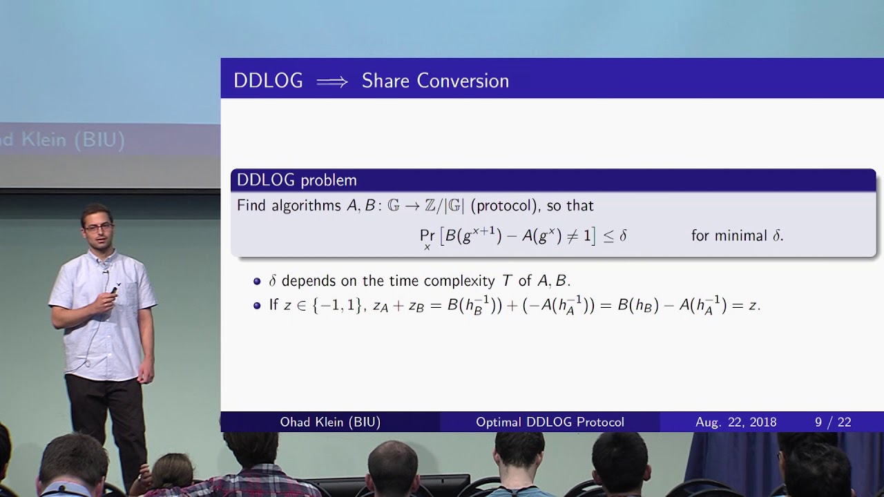 Abstract:The distributed discrete logarithm (DDL) problem was introduced by Boyle et al. at CRYPTO 2016. A protocol solving this problem was the main tool used in the share conversion procedure of their homomorphic secret sharing (HSS) scheme which allows non-interactive evaluation of branching programs among two parties over shares of secret inputs. Let g be a generator of a multiplicative group \mathbb{G}. Given a random group element g^{x} and an unknown integer b \in [-M,M] for a small M, two parties A and B (that cannot communicate) successfully solve DDL if A(g^{x}) - B(g^{x+b}) = b. Otherwise, the parties err. In the DDL protocol of Boyle et al., A and B run in time T and have error probability that is roughly linear in M/T. Since it has a significant impact on the HSS scheme’s performance, a major open problem raised by Boyle et al. was to reduce the error probability as a function of T. In this paper we devise a new DDL protocol that substantially reduces the error probability to O(M \cdot T^{-2}). Our new protocol improves the asymptotic evaluation time complexity of the HSS scheme by Boyle et al. on branching programs of size S from O(S^2) to O(S^{3/2}). We further show that our protocol is optimal up to a constant factor for all relevant cryptographic group families, unless one can solve the discrete logarithm problem in a \emph{short} interval of length R in time o(\sqrt{R}). Our DDL protocol is based on a new type of random walk that is composed of several iterations in which the expected step length gradually increases. We believe that this random walk is of independent interest and will find additional applications.