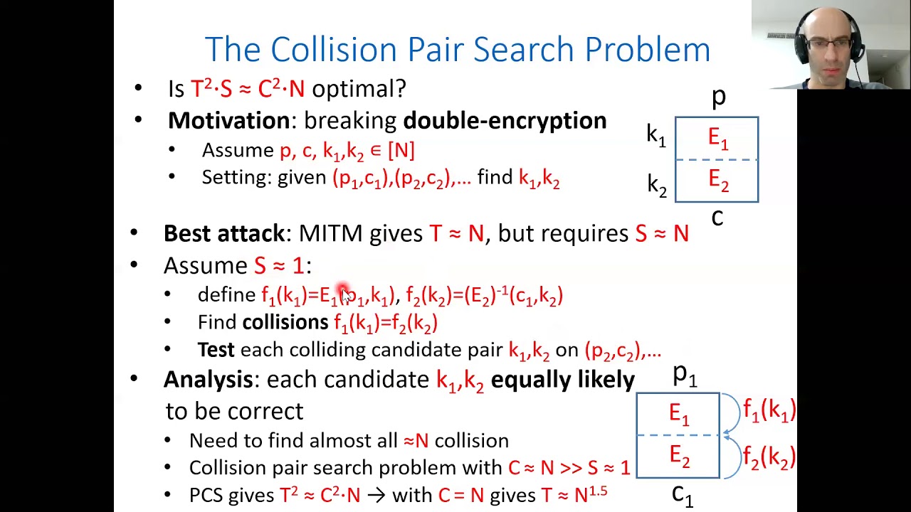 Abstract:We consider a collision search problem (CSP), where given a parameter C, the goal is to find C collision pairs in a random function f:[N] \rightarrow [N] (where [N] = \{0,1,\ldots,N-1\}) using S bits of memory. Algorithms for CSP have numerous cryptanalytic applications such as space-efficient attacks on double and triple encryption. The best known algorithm for CSP is parallel collision search (PCS) published by van Oorschot and Wiener, which achieves the time-space tradeoff T^2 \cdot S = \tilde{O}(C^2 \cdot N) for S = \tilde{O}(C). In this paper, we prove that any algorithm for CSP satisfies T^2 \cdot S = \tilde{\Omega}(C^2 \cdot N) for S = \tilde{O}(C), hence the best known time-space tradeoff is optimal (up to poly-logarithmic factors in N). On the other hand, we give strong evidence that proving similar unconditional time-space tradeoff lower bounds on CSP applications (such as breaking double and triple encryption) may be very difficult, and would imply a breakthrough in complexity theory. Hence, we propose a new restricted model of computation and prove that under this model, the best known time-space tradeoff attack on double encryption is optimal.